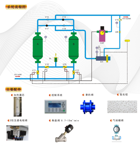 微熱再生干燥機采用的是變壓、變溫再生的工藝方法,它充分結合無熱再生快速吸附,有熱再生高溫解吸特點,與有熱再生相比,它采用較低再生溫度對吸附劑進行再生,它是不完全再生工藝。