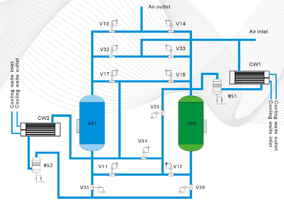 零氣耗余熱再生干燥裝置是一種節(jié)能型壓縮空氣干燥裝置,它由兩只交替使用的吸附器,兩只后部冷卻器,兩只氣水分離器,一套切換閥門(mén),一套控制系統(tǒng)組成。當(dāng)壓縮空氣通過(guò)吸附器的固定吸附床層,水分從濕空氣中分離。當(dāng)吸附劑工作了一定時(shí)間后,吸附達(dá)到飽和平衡,由空氣進(jìn)口引出的高溫空氣對(duì)吸附劑再生,以恢復(fù)吸附劑的吸附能力,后由經(jīng)過(guò)冷卻的空氣對(duì)吸附劑進(jìn)行吹冷。使得零氣耗余熱再生干燥裝置能長(zhǎng)期安全可靠運(yùn)行。